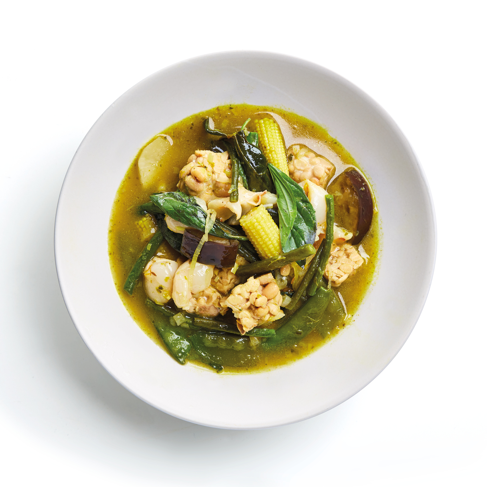 • Add the lime leaves, half the basil leaves and reduce heat to a simmer. Cook gently for 10-12 minutes or until the vegetables are tender.